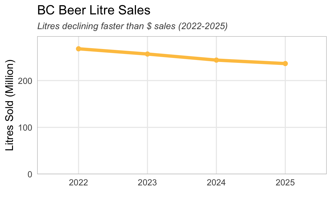 Beer sales in BC have been in long-term decline (especially in litres sold) and the trend has picked up since 2022.