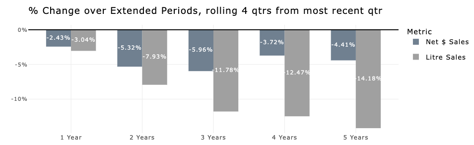 - 14% decline in litre sales over the last 5 years highlighting downward consumption trends.