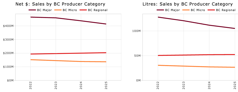 [maybe redundant? misplaced?] While the pace of decline has moderated somewhat compared to 2024, the overall direction remains negative. The data highlights three key dynamics: a steady multi-year decline in beer sales overall, even sharper reductions in volume than in dollar value (being offset by rising prices), and disproportionate role of declines in BC-produced beer, which accounts for the majority of beer sold in the province.