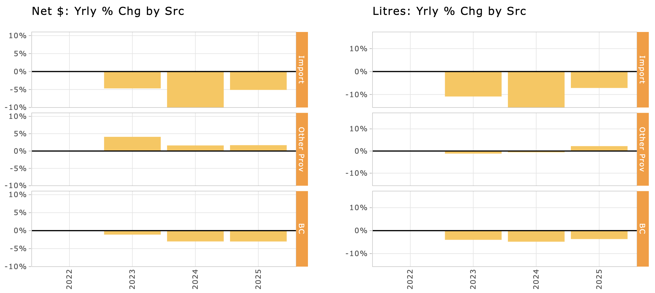 Annual data makes it clear that, while not dramatic, full‑year 2025 beer sales continued to soften, with net sales down 2.4% and litres down 3.0% year over year. BC beer remains the dominant category (about 78% of litres), and its decline is the main drag on the market, while imports contracted even faster on a percentage basis.